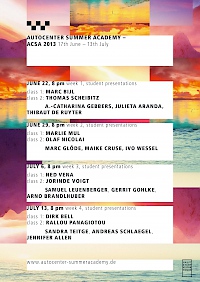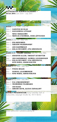 The Autocenter Summer Academy ACSA is a program, that connects international experts drawn from all fields of the arts with artists and students for weeklong courses of adventure, study and making in Berlin. Participants have the opportunity to develop their artistic practice and theory in interchange and interaction with their teacher – while at the same time immersing themselves in one of the most exciting city art scenes in the world.